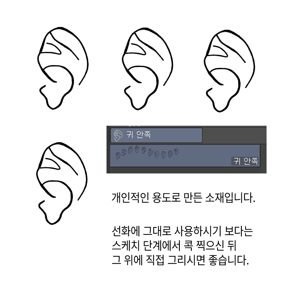 Dies ist ein spezieller, aurikelförmiger Pinsel für diejenigen, die Schwierigkeiten haben, ihre Ohren sorgfältig zu zeichnen. 귀를 꼼꼼히 그리는게 어려운 사람을 위한 측면 두상 전용 귓바퀴 모양 브러쉬 입니다.
