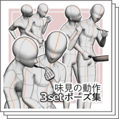 It is 3 sets of poses of eating action while cooking. 料理中に食べる動作のポーズ3セットです。