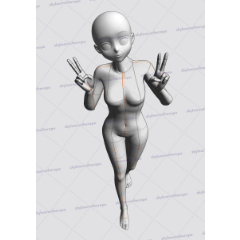 The character is looking up with both hands in a peace sign. The head is slightly tilted, with the pose being asymmetrical. The right hand higher than the left hand. The feet is not flat on the ground. Only the sole of the right foot is touching the ground. The left foot is raised.