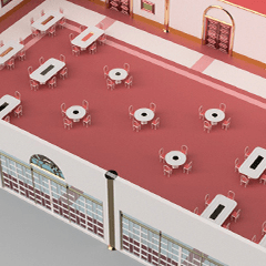 The size is large, 30m wide× 20m long× and about 7m high, but we carefully made chairs and explanation boards so as not to lose quality.