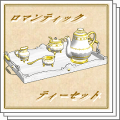 コーヒー・紅茶兼用ポット、シュガーポット、ミルクポット、ティーストレーナー、飾り彫りのある木製トレイの3Dオブジェクト5点セットと、以前『手作りマカロンセット』に同梱していた粉砂糖のブラシの素材集です。