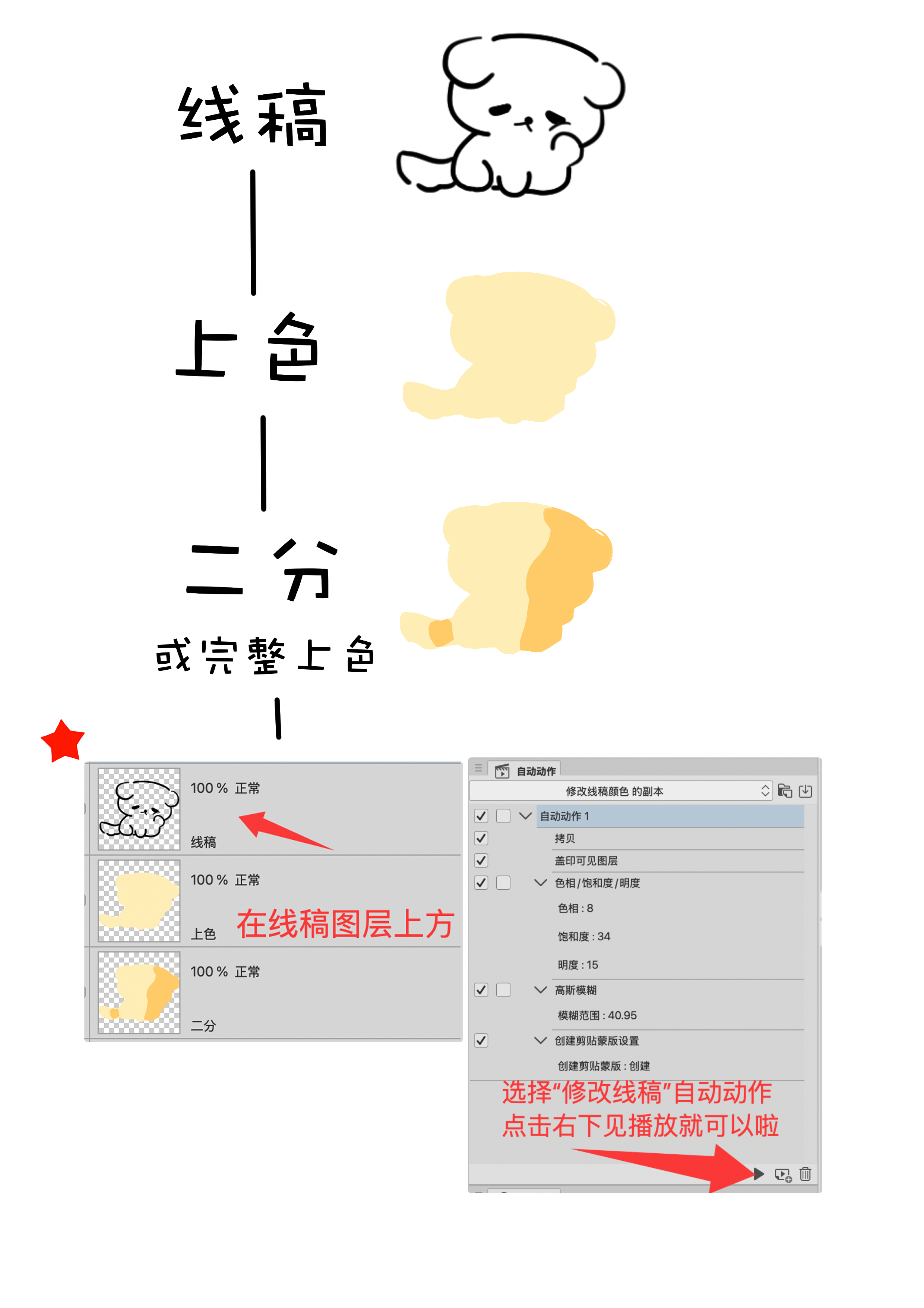 Habituellement, les bords du dessin au trait sont effacés pour révéler la couleur originale du dessin au trait.
