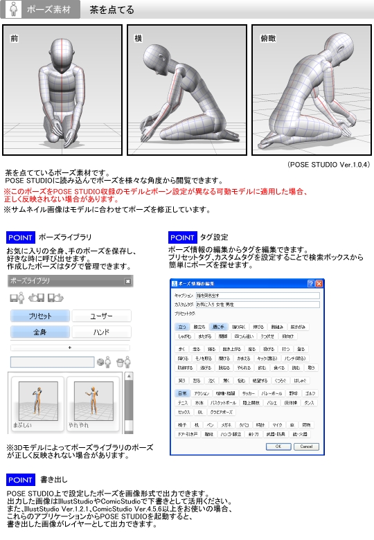 この素材は[POSE STUDIO]専用です。茶を点てているポーズ素材です。POSE STUDIOに読み込んでポーズを様々な角度から閲覧できます。※このポーズをPOSE STUDIO収録のモデルとボーン設定が異なる可動モデルに適用した場合、正しく反映されない場合があります。