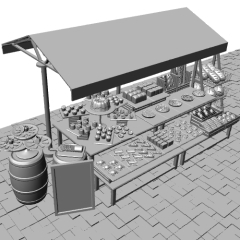 테이블, 스탠드, 접시, 선반, 통, 상자(2종), 접시 스탠드(2종), 간판, 칼, 도마, 상품(32종), 지붕, 바닥 등 13종의 아이템으로 구성되어 있습니다.