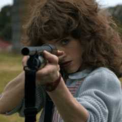 무릎에 손을 얹고 앉아서 바라보는 캐릭터의 경우
